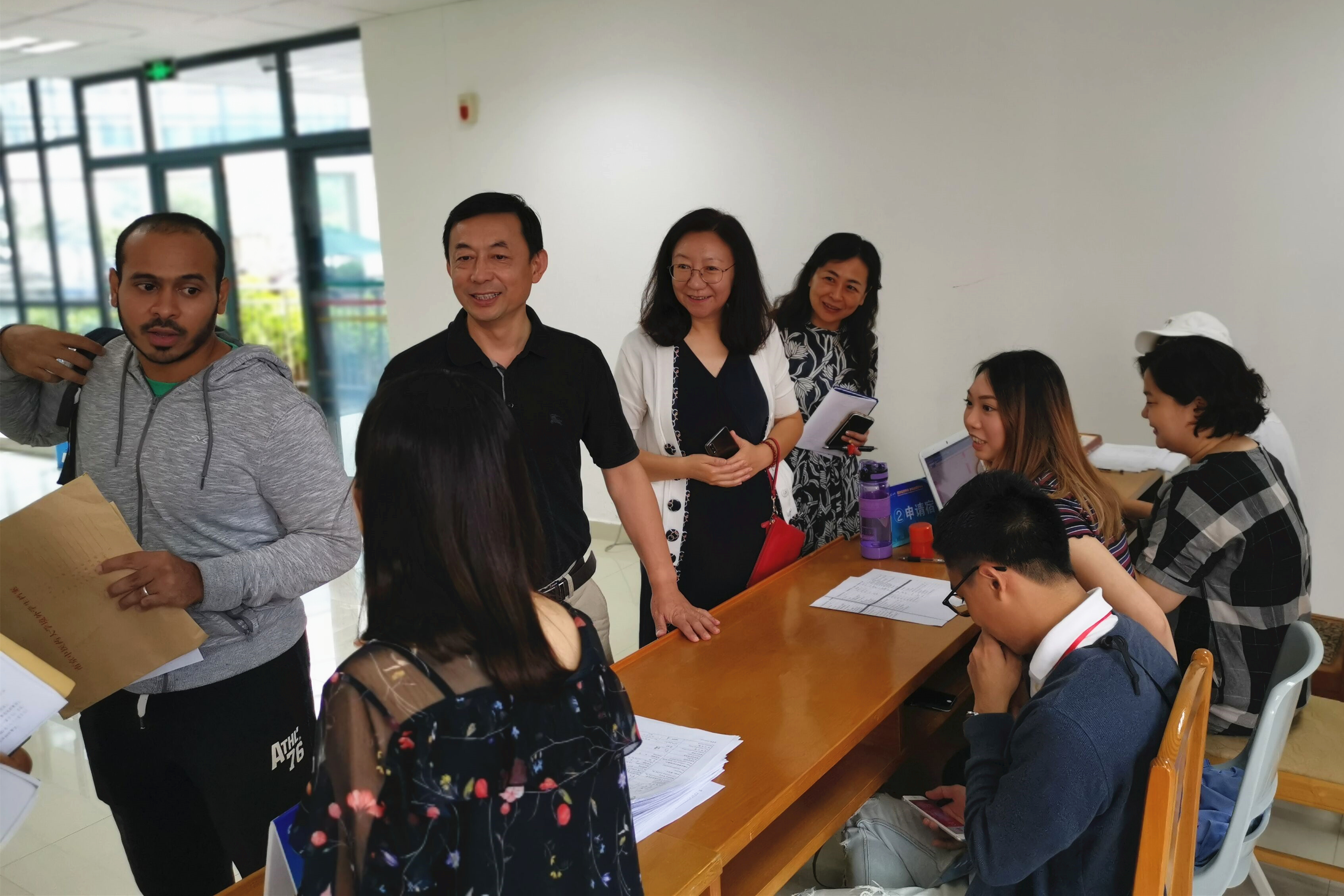 报到大厅内,志愿者们协助新生们完成报到手续,国际教育学院的老师们耐心细致地回答新生的各类问题。副校长孙志广来到迎新现场与新生交谈,了解并帮助他们解决初到学校所遇到的问题。