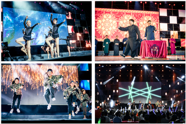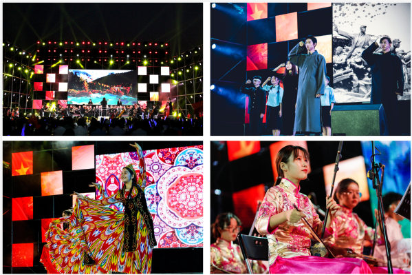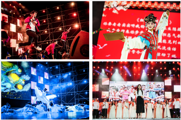 民乐合奏《高山青》描绘了“高山青,涧水蓝”的阿里山美景,带我们领略了高山族人民勤劳、幸福的生动画面,使观众感受到了质朴的温暖。健美操《What about Love》和舞蹈串烧《Don’t hold on back》《Dance Together》动感十足的舞姿无不彰显着南中医学子昂扬向上的青春活力和朝气蓬勃的精神风貌。快板《劝善歌》诠释了语言和神态表情极强的感染力。乐队表演《破茧成蝶》唱出了年轻人不顾一切地向前进,初心不改、矢志奋斗的豪迈情怀。京剧《京腔十三绝》淋漓尽致地展现了国粹京剧的无限魅力和浓厚的文化内涵。现代舞《从新开始》曼妙的舞姿、飘逸的音符,跳出了当代大学生告别过去,展望未来,力求上进的决心和勇气。《保卫黄河》歌唱出黄河雷霆万钧的轰鸣,气冲霄汉,响遏行云,这是炎黄华胄内心深处的起搏,是中华儿女不屈不挠、保卫祖国的必胜信念。我和我的祖国,是一首唱不完的赞歌,是杏林学子对祖国母亲的美好祝愿。最后,全场起立,齐声高唱《我和我的祖国》,国旗飘扬、歌声嘹亮。