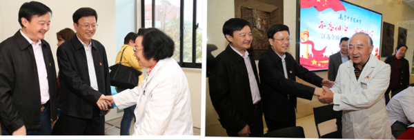 其间,江苏省委主题教育第七巡回指导组组长江里程、南京中医药大学党委书记程纯等领导来到国医堂门诊部服务点,亲切探望并慰问了所有参加义诊的医护工作人员。江里程组长充分肯定此次健康服务大行动的意义,高度赞扬以邹燕勤为代表的全体义诊医护工作者是传扬发展中医药事业、将“不忘初心、牢记使命”深入落实到为人民医疗健康服务中的典范。