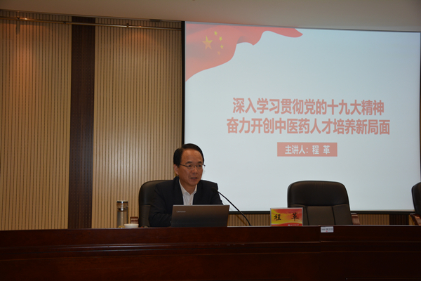 开班仪式后,程革副书记以《深入学习贯彻党的十九大精神 奋力开创中医药人才培养新局面》为题作专题辅导报告。他从深刻领会十九大的主题和主要成果等九个方面对党的十九大精神和习近平总书记发展中医药的新思想新论断新要求作深入解读。程革副书记强调,学员同志们要在政治追求上坚定信念,在学习生活上奋发有为,在奉献服务上率先带头,要勇于担当,主动作为,以更高的起点、更高的要求、更高的标准为创建高水平、有特色、国际化的一流中医药大学而努力奋斗。