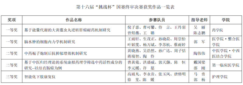 本届大赛由共青团中央、中国科协、教育部、中国社会科学院、全国学联和北京市人民政府共同主办,北京航空航天大学承办,共有213所高校的447件作品角逐终审决赛。在今年“挑战杯”赛事机制方面进行重大改革的背景下,我校是荣获“优胜杯”高校中唯一一所中医药院校,总成绩排名居全国高校前列。中医学院•中西医结合学院、医学院•整合医学学院、第一临床医学院等学院首次实现自然科学类作品的奖项突破。