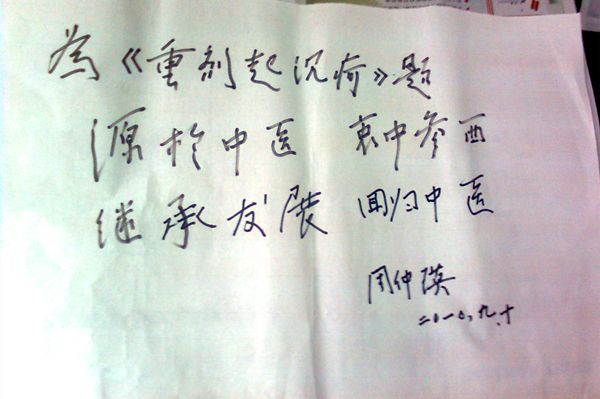 周仲瑛教授为仝小林著作《重剂起沉疴》题词(2010年9月)
