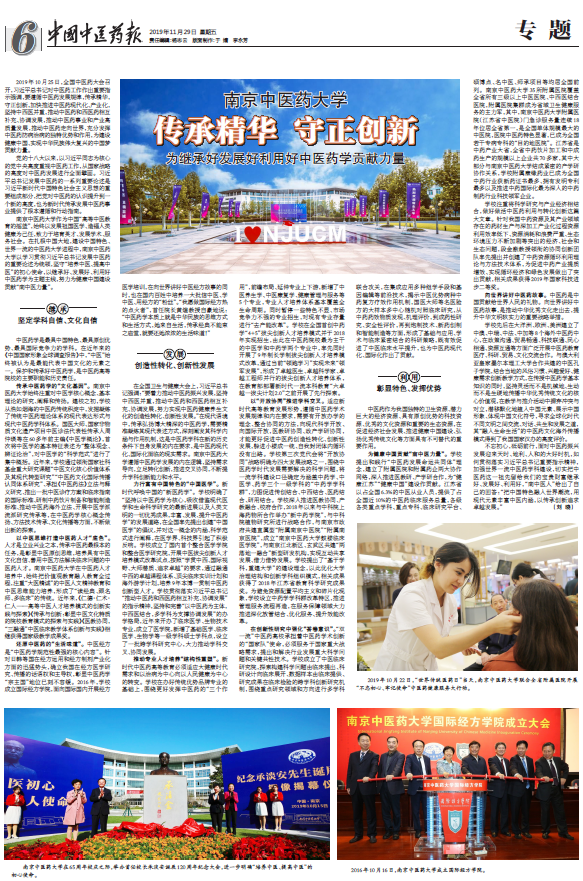 南京中医药大学作为中国“高等中医教育的摇篮”,始终以发展祖国医学、造福人类健康为己任,致力于培育英才、发展学术、服务社会。在扎根中国大地,建设中国特色、世界一流的中医药大学进程中,南京中医药大学以学习贯彻习近平总书记发展中医药的重要论述为统领,坚守“培养中医、提高中医”的初心使命,以继承好、发展好、利用好中医药学为主题主线,努力为健康中国建设贡献“南中医力量”。