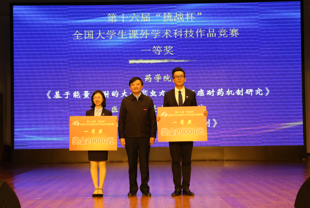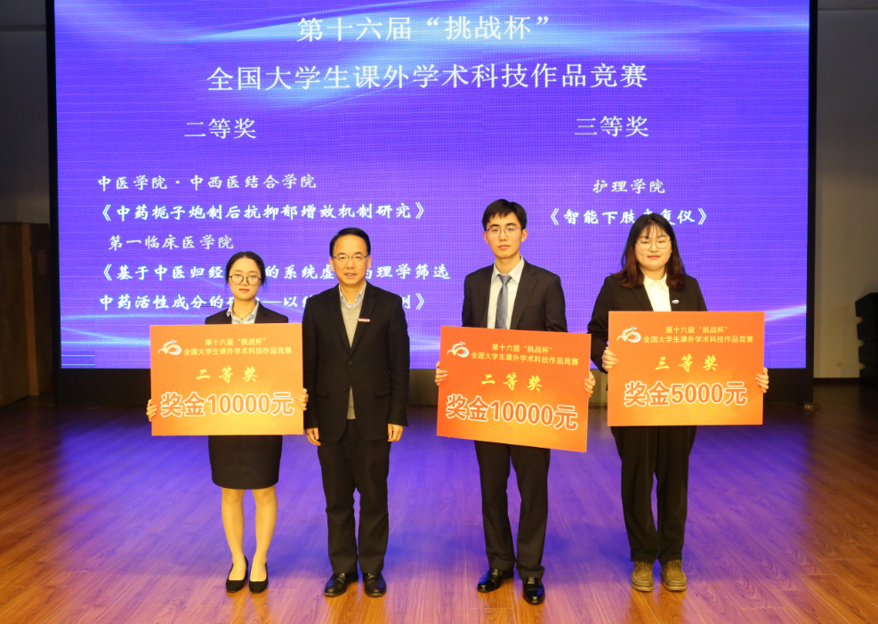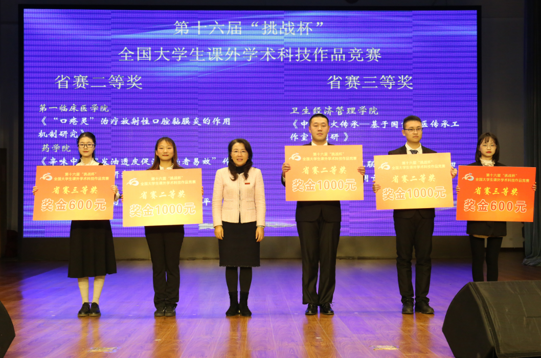 大会通过视频回顾了我校第十六届“挑战杯”赛事的备赛历程、精彩瞬间、挑战故事和成绩荣誉。乔学斌副校长宣读《关于表彰第十六届“挑战杯”大学生课外科学技术作品竞赛南京中医药大学获奖项目的决定》。