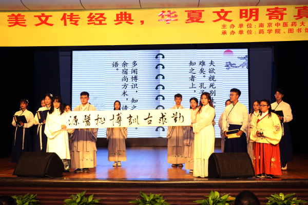 阅读传承经典,书香润泽校园。2019年12月11日晚,南京中医药大学“杏林飘香”读书月成果汇报暨闭幕式在大学生活动中心青春剧场举行。学工处处长屠宏斐、处长助理马新飞,图书馆、江苏省中医药博物馆馆长李文林,团委副书记(主持工作)陈小进,人工智能与信息技术学院党委书记殷明,药学院党委书记吴啟南,药学院院长曹鹏,图书馆副馆长张云,以及各学院学工书记、辅导员及学生代表等近400人参加了本次活动。