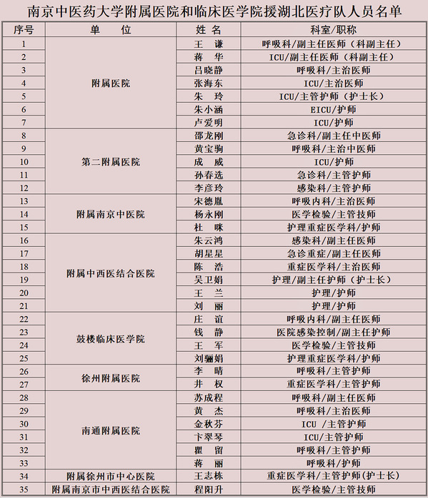 1月23日下午,按照江苏省卫健委组建医疗队支援湖北的统一部署,我校各家附属医院迅速响应,积极行动。疫情就是命令,防控就是责任!接到动员倡议后,各医院呼吸科等相关科室医护员工纷纷主动请缨,自愿加入医疗队。根据疫区所需医护人员的配置,最终学校附属医院、第二附属医院、附属南京中医院、附属中西医结合医院、鼓楼临床医学院、徐州附属医院、南通附属医院、附属徐州市中心医院、附属南京市中西医结合医院等9所附属医院、临床医学院在报名人员中遴选出共计35名医护人员,迅速完成医疗队组建工作。