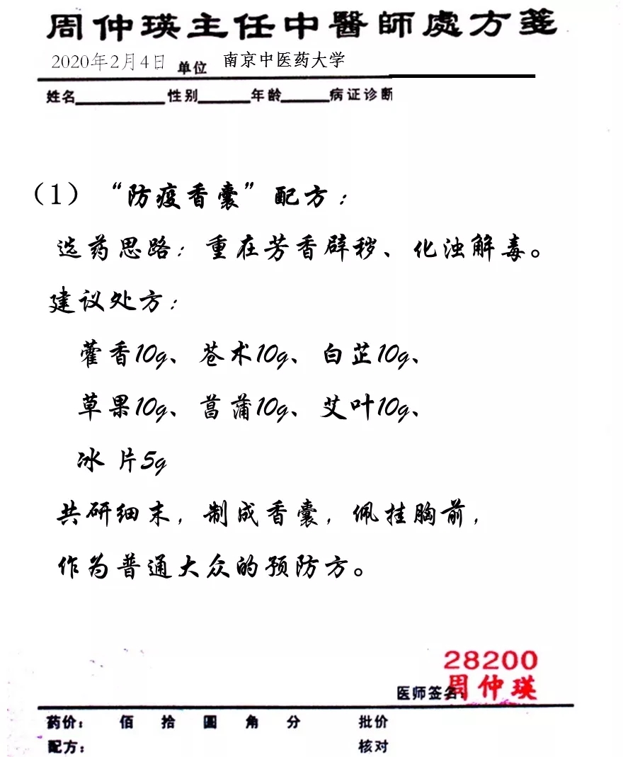 另据了解,南京中医药大学已经按照周仲瑛教授拟定的配方组织学生志愿者加紧赶制香囊,第一批香囊预计于近期制作完成并用于公众预防。
