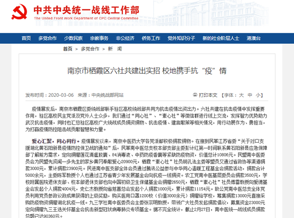 【编者按:自新冠肺炎疫情爆发以来,我校统战系统广大成员在校党委的坚强领导下,深入贯彻落实习近平总书记关于疫情防控工作重要讲话和指示批示精神,按照“坚定信心、同舟共济、科学防控、精准施策”的总要求,充分发挥中医药优势与特色,挺身而出、英勇奋斗、扎实工作,全身心投入疫情防控阻击战,在基础预防、医疗救护、物资捐助、建言献策、服务保障等方面开展了大量的工作,做出了应有的贡献,得到社会广泛认可,展现了当代南中医统一战线系统的精神风貌和责任担当。近日,我校统战系统在抗击新冠肺炎疫情工作中的相关事迹相继被各级统战部门官网专题报道。】