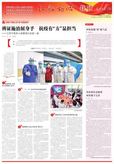 《人民日报》2月18日6版以《江苏派出2494名援鄂医疗队员——“既然到了战场,就要把仗打赢”》为题,关注报道了由我校多所附属医院医护人员组成的国家中医医疗队(江苏)在武汉江夏大花山方舱医院的工作情况。《光明日报》2月15日头版、2月26日头版、3月11日5版多次在重要版面分别以《方式不同 目标一样——走进武汉首家中医方舱医院》《好医配好药 打赢阻击战——武汉主战场中医抗击疫情纪实》《辨证施治展身手 抗疫有“方”显担当——江苏中医药人驰援湖北抗疫一线》为题重点报道了来自我校各附属医院的江苏中医药人在湖北抗疫一线日夜奋战,以实际行动将“相信中医”写进患者心坎里的感人事迹。武汉14所方舱医院全部完成历史使命正式休舱后,《光明日报》3月11日7版“战‘疫’一线大家谈”专栏专题刊发了部分支援方舱医院一线专家署名文章,其中史锁芳教授以《发挥中医优势,全力解决患者痛苦》为题介绍了江夏方舱医院中医诊疗开展情况。《科技日报》2月20日以《南京97岁重症患者被成功治愈,怎么做到的?》为题介绍了我校附属南京医院在国医大师周仲瑛教授团队制定的中医辨治方案指导下,采用中西医结合诊疗方法成功救治新冠肺炎确诊患者的案例。