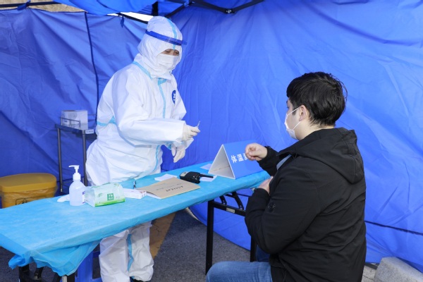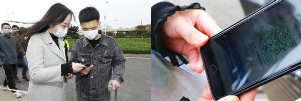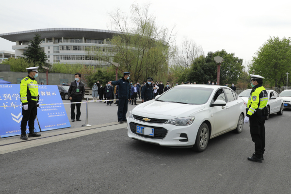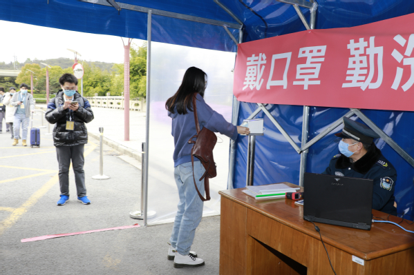 3月27日下午,南京中医药大学仙林校区,数百米警戒线将学校北门广场划分出不同区域,一辆辆送学车辆在指定停车点陆续停靠,放下学生和行李后,在交警和保安指挥下,按照指示牌上“即停即走”的温馨提示有序驶离。学生根据指引牌提示和志愿者引导,相互间隔1米,沿指定通道依次排队等待入校前的检测。