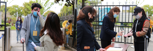 正常入校的学生在宿舍楼附近下车,间隔1米有序排队进入宿舍管理站,志愿者对他们进行第二次测温,测温合格后经过手消、登记等程序,领取疫情防控期间临时出入证进入宿舍。