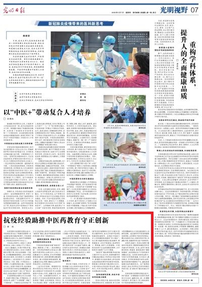 《光明日报》特邀我校党委书记程纯,北京中医药大学党委书记谷晓红,武汉大学副校长、医学部部长唐其柱三所“双一流”大学的负责人,围绕医科建设和中医学科发展展开讨论,并于5月7日以“新冠肺炎疫情带来的医科新思考”专题整版刊发三位高校负责人的署名文章。