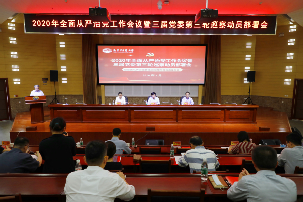 5月19日下午,学校召开2020年全面从严治党工作会议暨三届党委第三轮巡察动员部署会。校党委书记程纯到会并讲话。全体在宁校领导,校党委委员、纪委委员,巡察工作领导小组成员,全校中层干部,第三轮巡察巡察组全体成员以及全校正科级干部分别在主会场丰盛楼学术报告厅和分会场B7教学楼参加会议。会议由校党委常委、纪委书记张玉清主持。