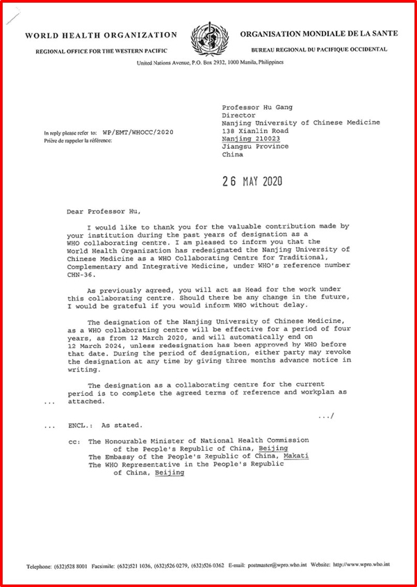 世界卫生组织致函胡刚校长,再次确认我校连任传统医学中心(第十任期)