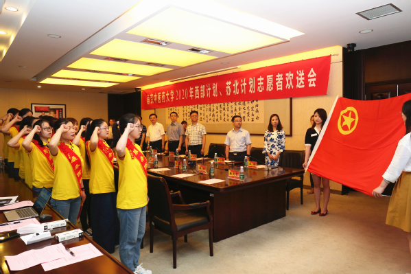 会议最后,西部计划、苏北计划全体志愿者庄严宣誓。大学生志愿服务西部计划、苏北计划是国家和江苏省推动西部、苏北地区加快发展、科学发展的一项人才工程。自2003年启动以来,我校累计选拔248名优秀学子参与到西部计划、苏北计划中。今年,我校共有80名学生报名西部计划、苏北计划,经过学校推荐、省级项目办面试考核等环节,依据择优录取原则,我校共计5名同学入选西部计划面上项目,5名同学入选西部计划研究生支教团专项,5名同学入选苏北计划。他们将青春与热情播撒在祖国最需要的地方,体现了当代青年朝气蓬勃、奋发有为的精神面貌,传承了南京中医药大学“自信 敬业”的校训精神,祝愿他们秉承南中医人艰苦创业的优良传统,用学识和汗水在投身实现中国梦的伟大实践中,抒写奉献、勇敢、进取、无悔的青春篇章!