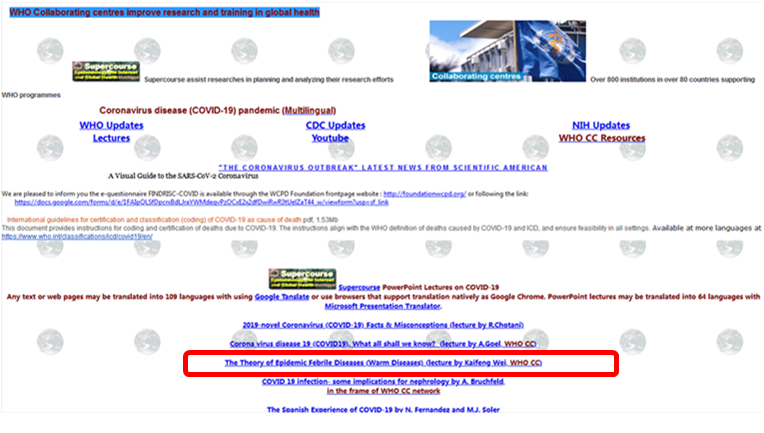 7月8日,我校中医学院·中西医结合学院魏凯峰副教授团队《温病理论与抗疫案例》全英文课件在匹兹堡大学Supercourse网站COVID-19专栏发布。通过国际知名的公共卫生与流行病学领域网络学术交流平台,向世界各国专家学者分享中医温病学科抗击新冠肺炎疫情的学术进展与经验,既展现了中医药在全球医疗卫生体系建设中的责任担当,也是我校作为WHO传统医学合作中心积极推进人类卫生健康共同体建设的积极尝试。