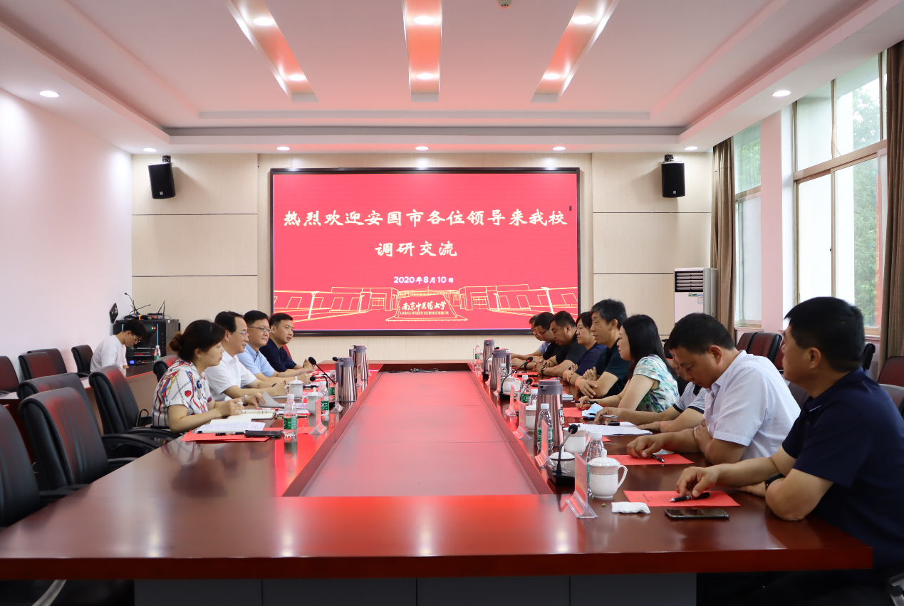 8月10日上午,安国市政协党组书记、主席刘子仁,安国市人民政府副市长刘婷,安国市政协副主席张会娟等一行九人来我校调研交流。校党委副书记程革出席会议,党委办公室、党委组织部、党委统战部相关负责同志参加会议。会议由党委组织部、统战部常务副部长王珏主持。