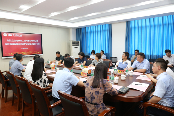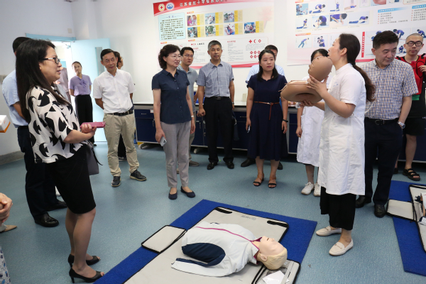8月20日下午,南京市人大常委会副主任陈华、副秘书长张挚、教科文卫委员会主任陈炜一行来我校调研应急救护培训基地建设工作。南京市红十字会党组书记张敏,市红十字会党组成员、副会长张杰,南京中医药大学副校长孙志广,党委办公室、校长办公室、团委、护理学院相关负责同志陪同调研。