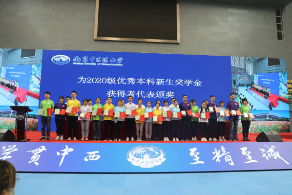 党委常委、副校长、附属医院党委书记方祝元宣读《关于表彰2020年度“优秀本科新生奖学金”获得者的决定》,主席台领导和嘉宾为新生奖学金获得者代表颁奖,并赠送由学校主编的《中药大辞典》。