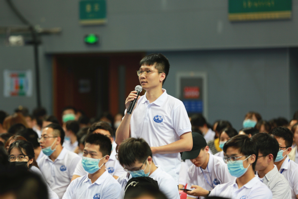 胡刚带领新生们回顾了我国恢复研究生教育42年来取得的辉煌成就。他讲到,在2020年这个特殊年份入学的研究生,不仅是站在人生道路的新起点上,更是身处“两个一百年”的历史交汇点上。在激烈的国际竞争面前,研究生应当坚持勤思、明辨、力行,面向世界科技前沿、面向经济主战场、面向国家重大需求、面向人民生命健康,肩负起历史责任,不断奋进、追求卓越。