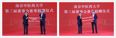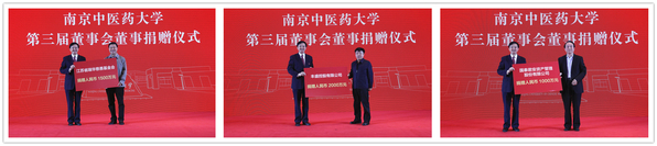 第三届董事会董事长、学校党委书记程纯现场接受了江苏省瑞华慈善基金会、丰盛控股有限公司、国泰君安资产管理股份有限公司、中国银行股份有限公司江苏省分行、南京市江宁人民医院等董事单位代表的捐赠,并向长期心系中医药育人事业、利用平常的收入在学校设立奖学金、激励后学的优秀教师代表汪受传教授、杨进教授、吴承玉教授颁发了证书。