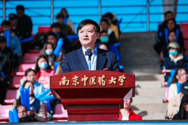 程纯致开幕词,他表示,我校体育运动有着优良的传承,体育工作是学校广大师生医护员工身心健康发展的助燃剂,体育工作也为学校事业发展增添了无尽的生机与活力。致辞的最后,程纯宣布南京中医药大学第四十三届运动会正式开幕。