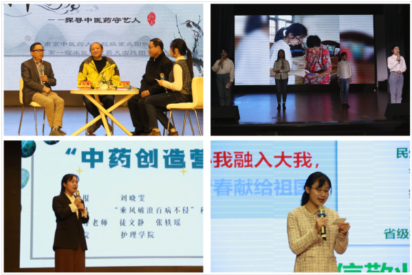 获奖集体和个人代表在表彰大会上进行成果展示。第一临床医学院的校级重点立项团队“薪火”实践团邀请原人文与政治教育学院院长、硕士生导师金鑫教授,国医大师周仲瑛教授学术经验继承人、博士生导师郭立中教授,附属医院(江苏省中医院)主任中医师顾和亚三位中医药专家来到现场,通过采访对话的形式再现暑期寻访中医“守艺人”的过程。访谈中,三位老师就中医药的传承发展表达了各自见解,并对南中医学子怀揣远志、厚朴求学,争做胸有大志、心有大我、肩有大任、行有大德的“中医追梦人”提出殷切期望。