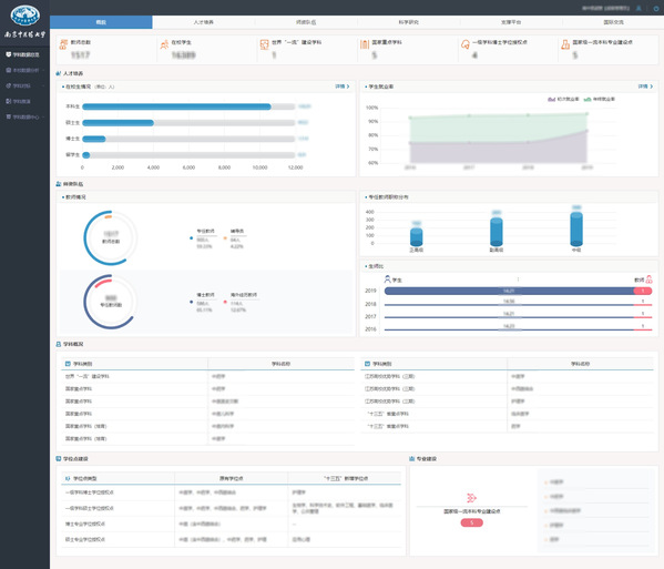 针对学校学科数据管理中存在的数据采集与整理效率低、数据管理缺乏常态化有效维护机制等方面问题,“双一流”建设处着力构建一个“统一管理、开放共享”的学科建设数据管理平台,平台可实现对学科数据的统一管理,实时分析我校学科建设的状态和水平,为学科建设与发展规划提供强有力的数据支撑。同时,也可实现学科数据的共治、共通和共享,为学校各类相关业务提供客观数据支持。