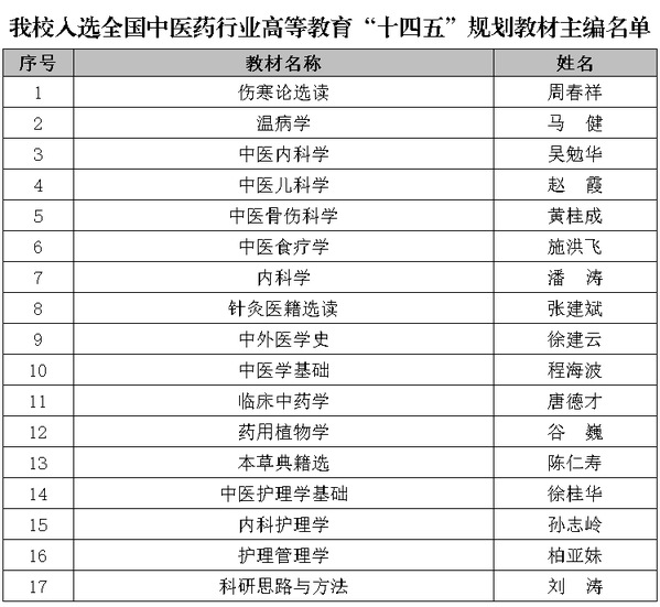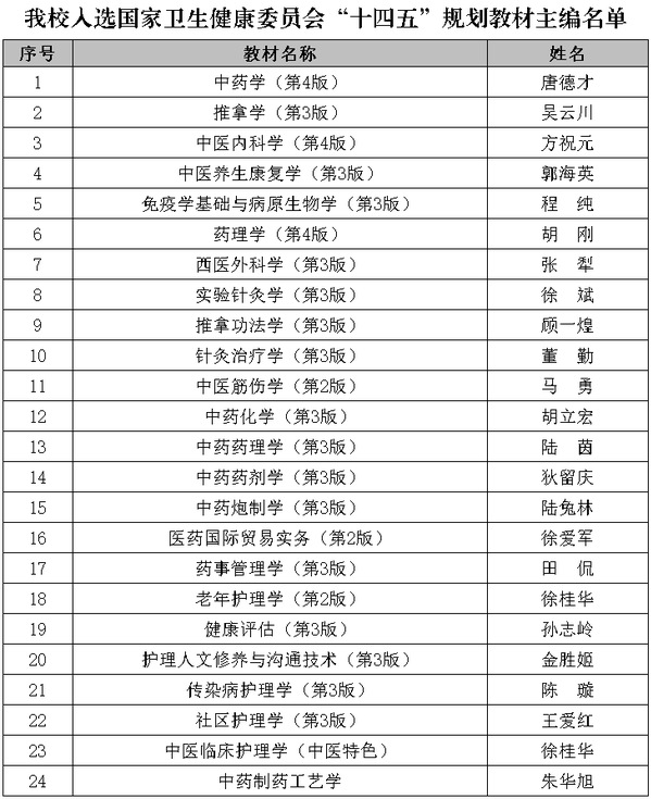 近日,国家卫生健康委员会和中国中医药出版社分别公布“十四五”规划教材申报结果。我校在全面梳理“十三五”规划教材参编情况,认真总结编写经验的基础上,充分发挥教材建设历史积淀优势,积极组织教师申报。截至目前,我校共计24部教材获国家卫生健康委员会“十四五”规划教材主编立项,17部教材获全国中医药行业高等教育“十四五”规划教材主编立项,主编立项数位居全国同类院校前列。