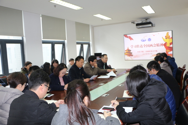 3月17日下午,中医学院•中西医结合学院在丰盛楼526会议室召开会议,传达学习全国两会精神。学院全体党委委员、支部书记、支委和党小组组长参加会议。会议由学院党委副书记周琼主持。