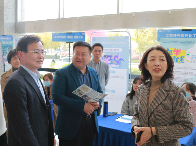 栖霞区副区长袁文峰率区人社局、区妇联、栖霞高新区有关负责人到现场了解招聘情况与企业需求。校党委常委刘晓,学生工作处处长屠宏斐详细介绍了2021届毕业生专业构成与就业情况,校地双方就高校毕业生就业需求与企业招聘需求等方面作深入交流。