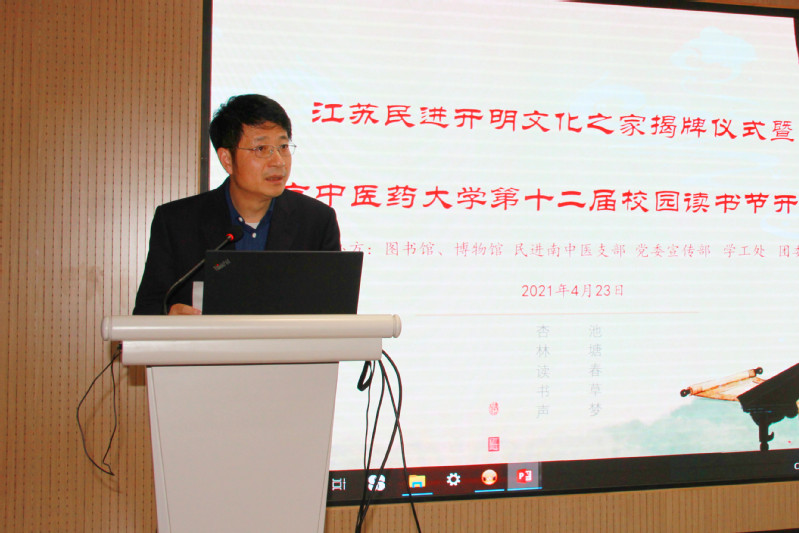 4月23日,“江苏民进开明文化之家”揭牌仪式暨南京中医药大学第十二届校园读书节开幕式在仙林校区敬文图书馆举行。民进江苏省委专职副主委、省政协副秘书长朱毅民,国家一级美术师、著名书画家萧平及夫人邹正玉;我校党委书记程纯,副校长、民进江苏省委副主委曾莉,副校长胡立宏等出席活动。活动由图书馆、博物馆馆长李文林和民进南中医支部主委陈军共同主持。