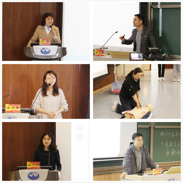孙蓉老师结合现场演示,为志愿者带来一场精彩生动的心肺复苏、AED使用方法、常见外伤处理等应急救护知识培训。施叶叶老师从学科建设、人才培养、科学研究、学校特色等方面带领志愿者系统回顾了我校的发展历史。黄爱国老师结合参与汶川抗震救灾的亲身经历,用轻松幽默的语言列出志愿服务过程中可能出现的六大心理困惑,并带领志愿者现场体验了呼吸调整、正念练习等多种心理调适方法。