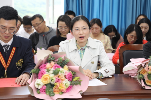 与会领导和师生代表为获得总冠军的团队成员朱婧怡、李洵、彭文雯、曹祥献花,并合影留念