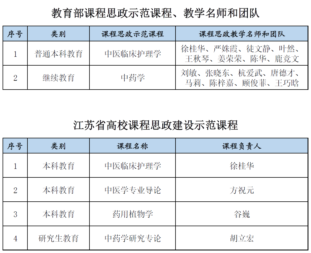 近日,教育部和江苏省教育厅公布了首批课程思政示范项目评审结果,我校获评教育部课程思政示范课程2门、课程思政教学团队2支,江苏省高校课程思政建设示范课程4门,入选数量位居全国中医药院校前列。