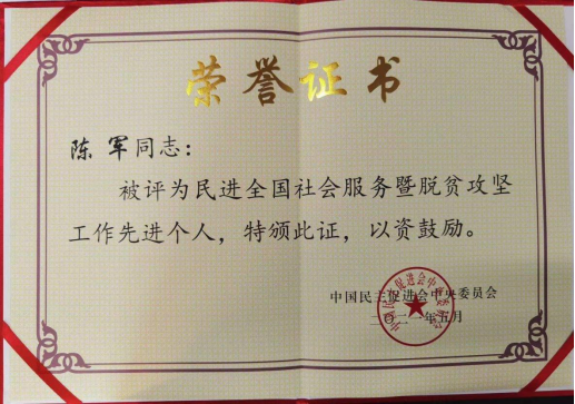 长期以来,陈军教授作为民进会员,具有较强的参政议政意识,立足于双岗建功,自觉推进社会服务与参政议政相结合,积极服务中药资源产业发展助力脱贫攻坚,完成3项民进省委调研课题,研究成果被民进江苏省委采用,并获得民进江苏省委参政议政成果一等奖1项、二等奖2项。此次获奖是民进南京中医药大学总支自2018年以来连续第四年获得民进中央表彰。