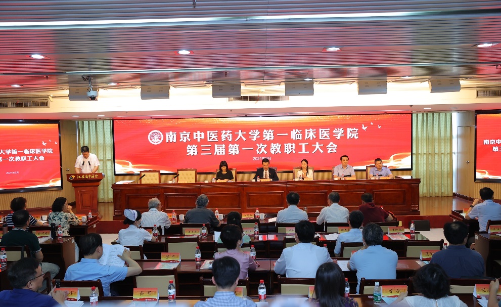 6月23日,南京中医药大学第一临床医学院第三届第一次教职工代表大会在附属医院南院学术报告厅召开。学院老领导、老专家、院领导、学系主任、教研室正副主任、科研中心(所)主任、办公室主任和学院全体教职工出席会议。会议由学院党委副书记、副院长沈永健主持。