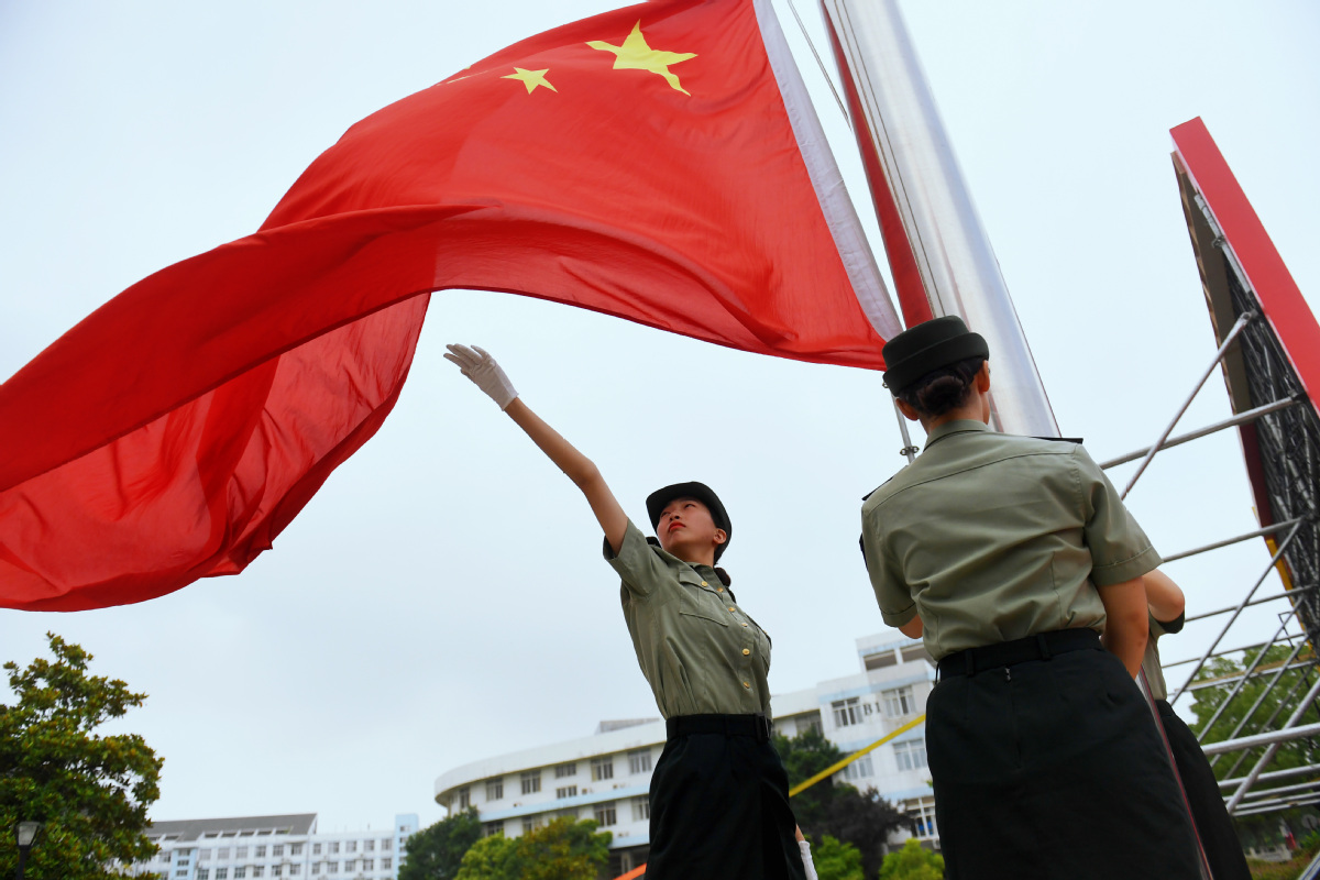 全国第一支大学生女子国旗班、南京中医药大学大学生女子国旗护卫队27名队员以铿锵有力的步伐、整齐划一的动作,护送国旗走向升旗台。在雄壮嘹亮的国歌声中,五星红旗迎风冉冉升起。