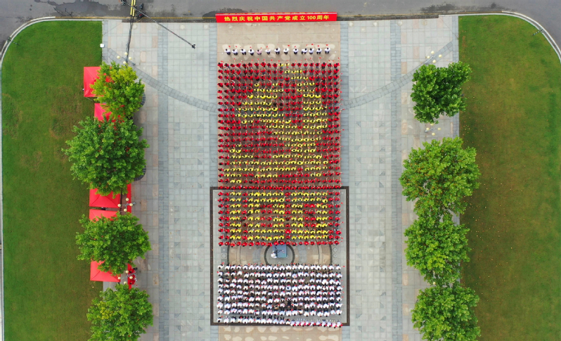 国旗广场上,600余名2021年新发展党员、发展对象和入党积极分子代表组成了党徽及“100”字样的方阵,以特殊的方式向党的百年光辉历程致敬。