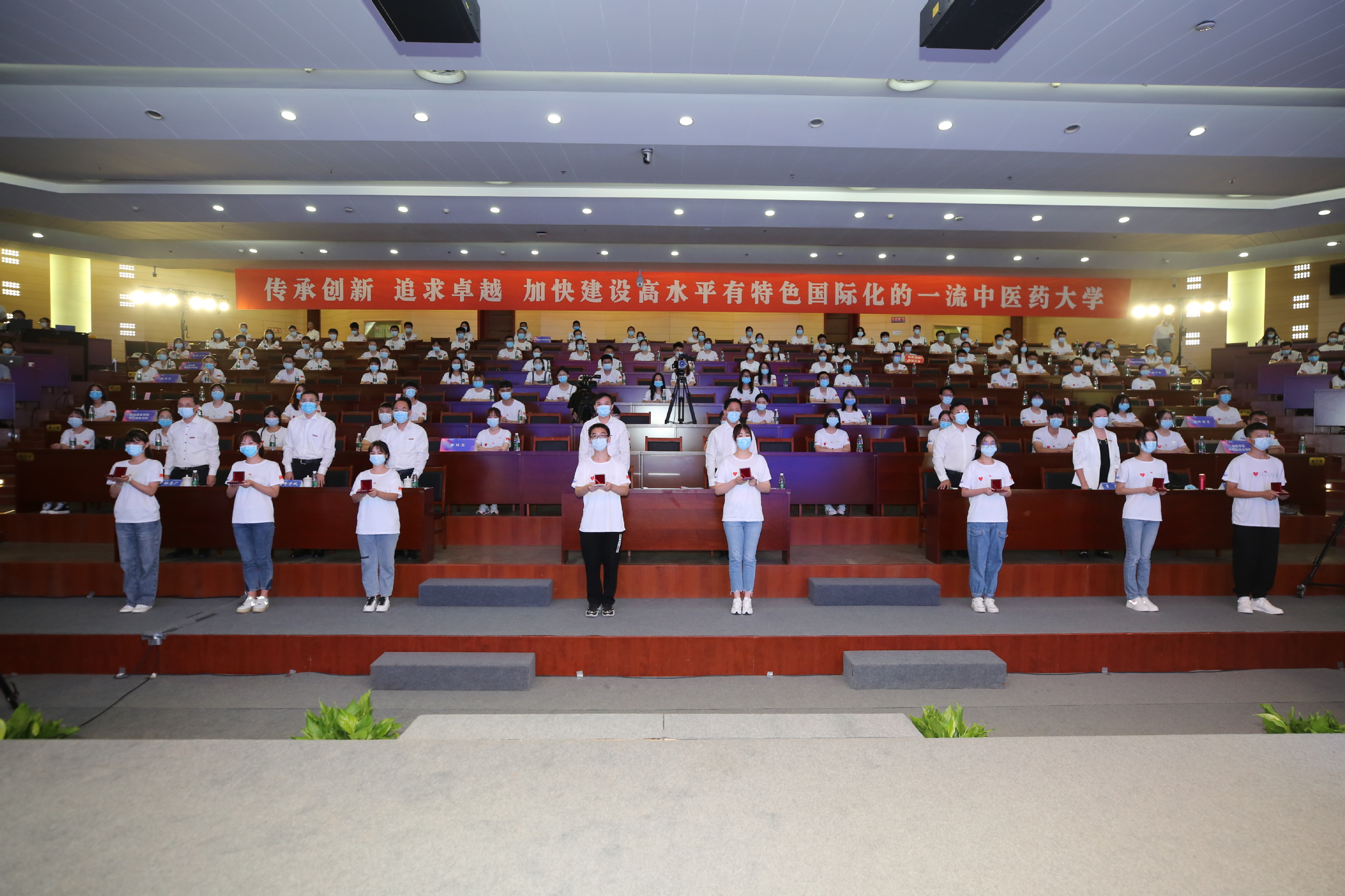 典礼上,校领导为新生代表发放校徽,激励广大新生在新时代绽放自己的青春光彩。全体新生在线上线下,以青春的名义,向祖国、向党和人民、向中医药事业、向青春梦想庄严宣誓。开学典礼在南京中医药大学校歌中落下帷幕。
