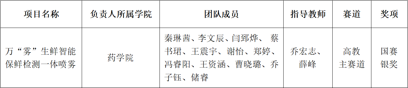 2021年10月12日-15日,由教育部等12个中央部委单位和江西省人民政府共同主办,南昌大学、南昌市人民政府和井冈山市人民政府承办的第七届中国国际“互联网+”大学生创新创业大赛全国总决赛在南昌大学举行。我校《万“雾”生鲜智能保鲜检测一体喷雾》项目荣获国赛银奖,这是我校首次有项目入围全国总决赛,实现了我校在国际大型青年创新创业赛事上的历史性突破。