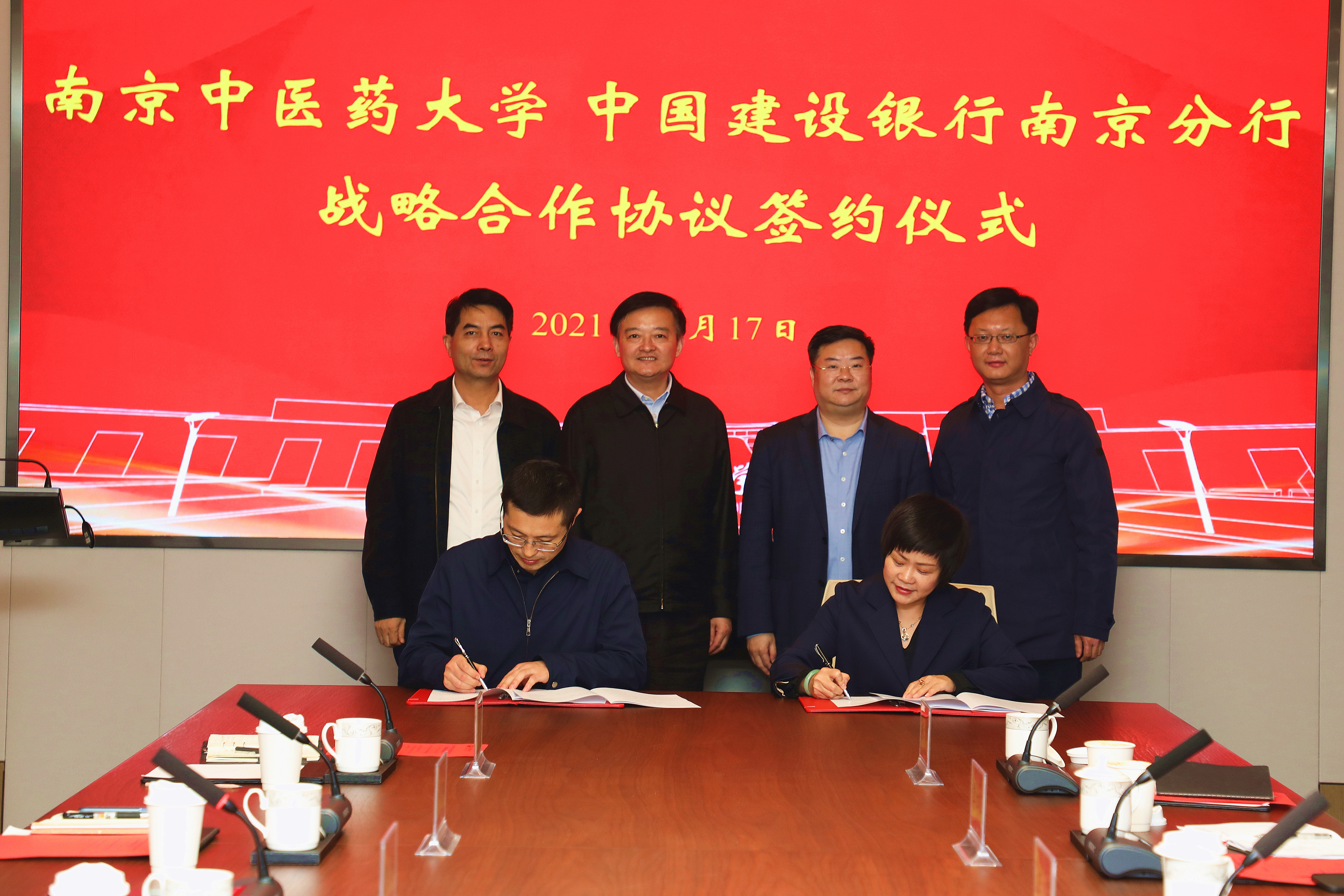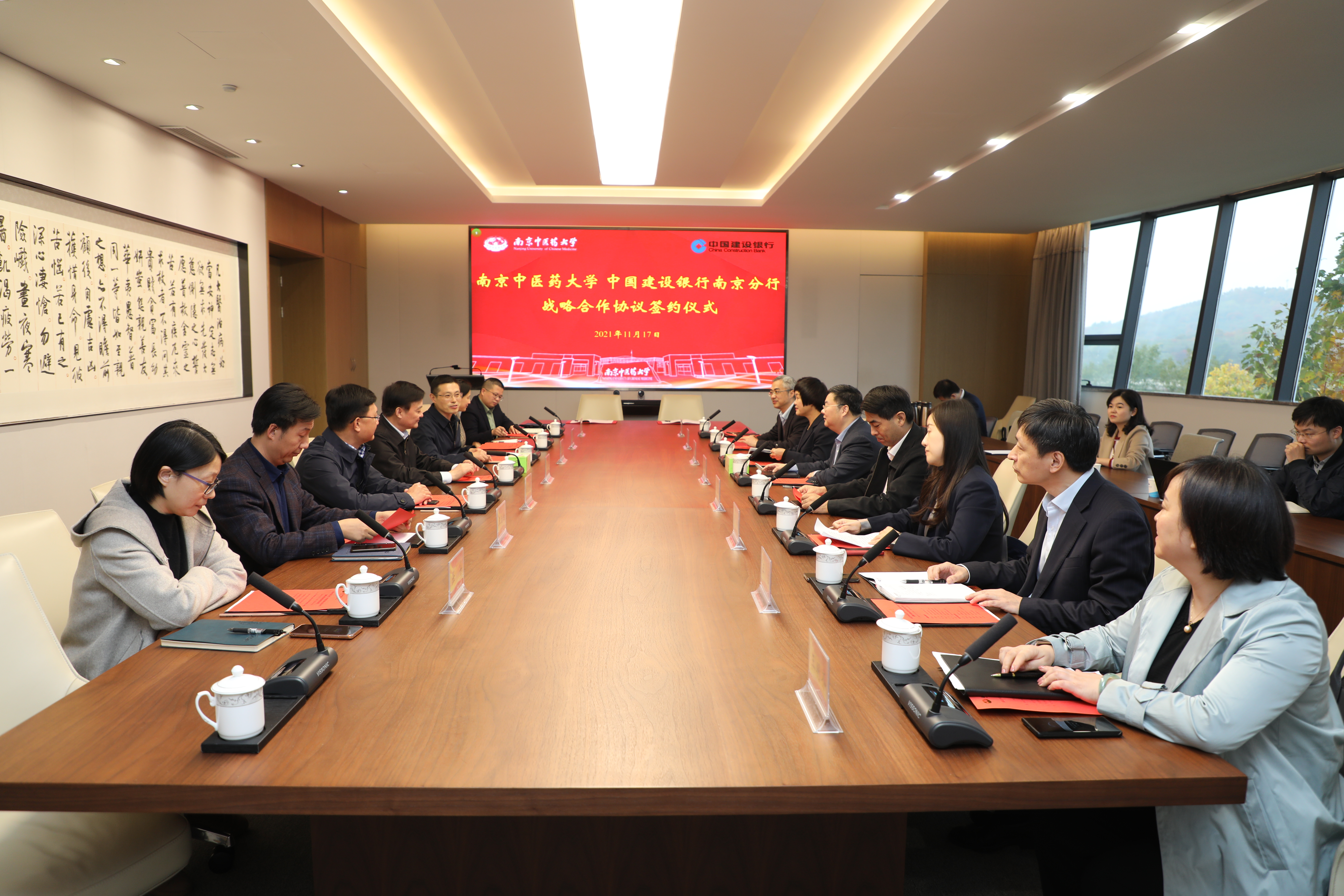 11月17日下午,南京中医药大学与中国建设银行南京分行战略合作协议签约仪式在仙林校区行政楼316会议室举行。中国建设银行江苏省分行党委书记、行长张伟煜、副行长陈宝权,中国建设银行南京分行党委书记、行长王芳,校党委书记程纯、副校长乔学斌以及双方相关职能部门负责人出席签约仪式。签约仪式由乔学斌主持。