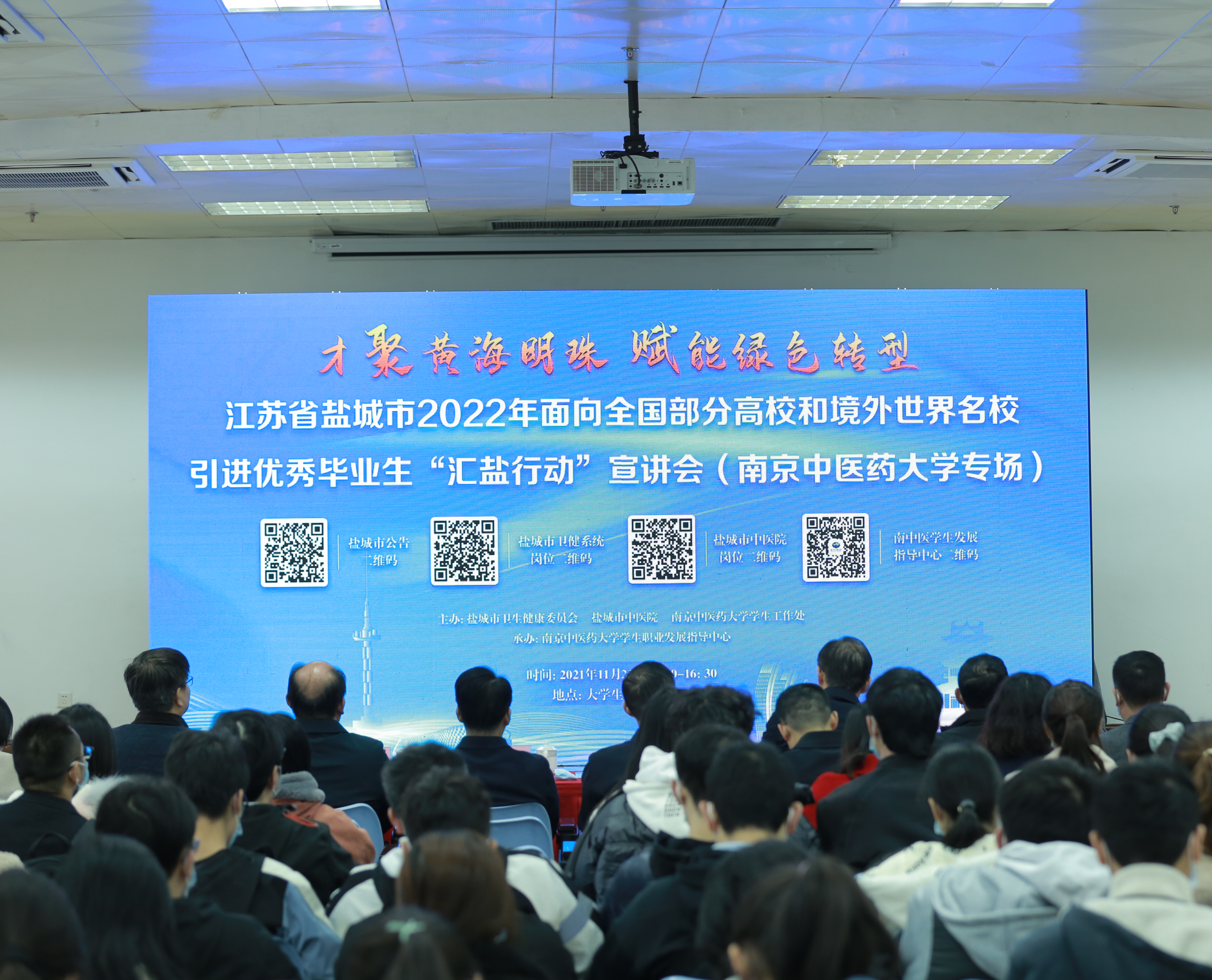 为贯彻落实中央人才工作会议精神,全面实施人才强市战略,11月23日下午,盐城市卫生健康委员会带队盐城市中医院等14家医疗卫生单位莅临我校,开展“才聚黄海明珠,赋能绿色转型”盐城市引进优秀毕业生“汇盐行动”宣讲推介会。本次宣讲推介会还作为“百校千企万岗”直播荐岗活动之一,进行了线上同步直播。盐城市卫生健康委员会副主任王勇、机关纪委副书记唐婷婷,盐城市中医院院长顾月星,党委副书记、纪委书记黄万春及盐城市所辖各市县卫生系统负责同志、招聘工作人员到场参会。我校党委副书记程革,党委常委、宣传部部长刘晓,学生工作处、研究生院主要负责人,各学院学工书记、就业工作人员参加本次会议。会议由学生工作处副处长苏文娟主持。