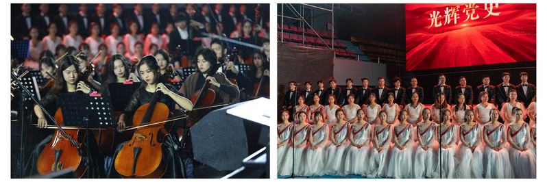 艺术党课分为“颂、读、学、传”四个篇章,在第一篇章《颂·经年芳华,杏林春晓党旗红》中,校大艺团交响乐团共同演绎《红旗颂》,师生合唱团慷慨高歌,青年学子朗诵铿锵有力,配合四组经典的红色主题雕塑造型舞蹈,呈现了中国共产党百年征程中开天辟地的峥嵘岁月,新中国的时代画卷徐徐展开。