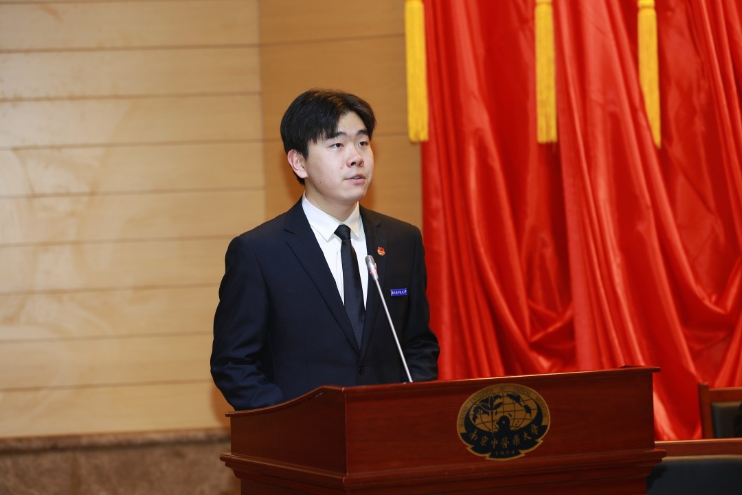第二十五届学生会主席团成员杨雯倩宣读《南京中医药大学第二十六次学生代表大会全体代表致全校同学的倡议书》,倡议广大青年坚定理想信念,赓续红色血脉,涵养家国情怀;崇尚修德明辨,坚持勤学务实,铸就青春梦想;矢志艰苦奋斗,练就过硬本领,谱写青春华章。