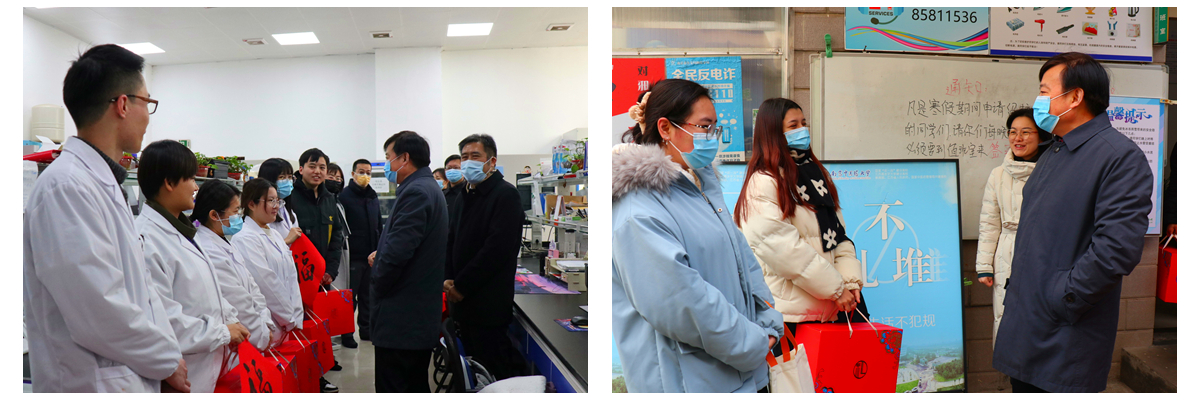 校领导一行向同学们送上新年大礼包、学生书写的“福”字和学工干部为留校学生制作的防疫香囊等新春礼物,祝愿同学们度过一个欢乐祥和的新年。