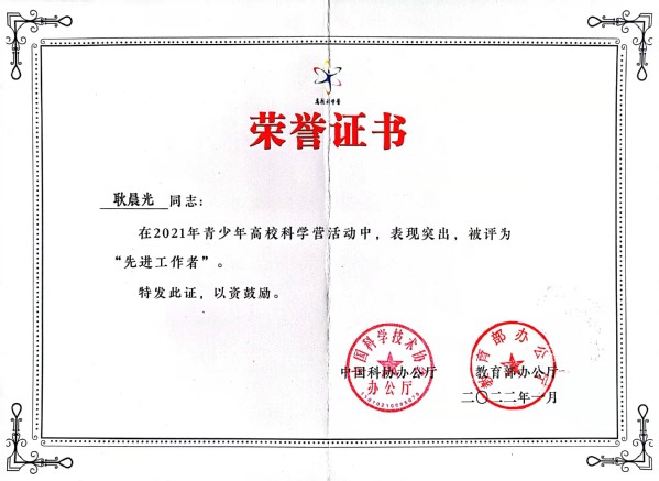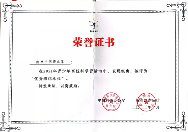 近日,在由中国科协和教育部共同主办的2021年青少年高校科学营组织评比工作中,我校获评“优秀组织单位”荣誉称号(全国共28家),1人荣获评“先进工作者”荣誉称号。