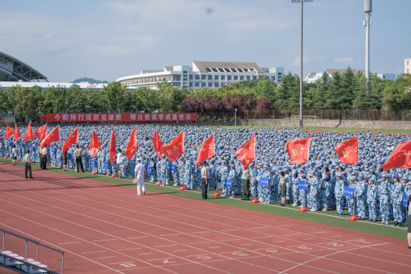 国旗飘飘,铸钢铁意志,军风巍巍,展飒爽英姿。军训动员大会在嘹亮的校歌声中落下帷幕。