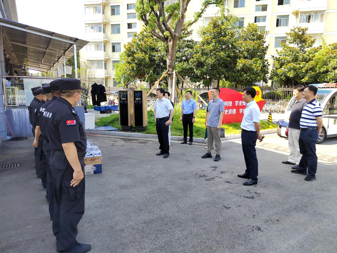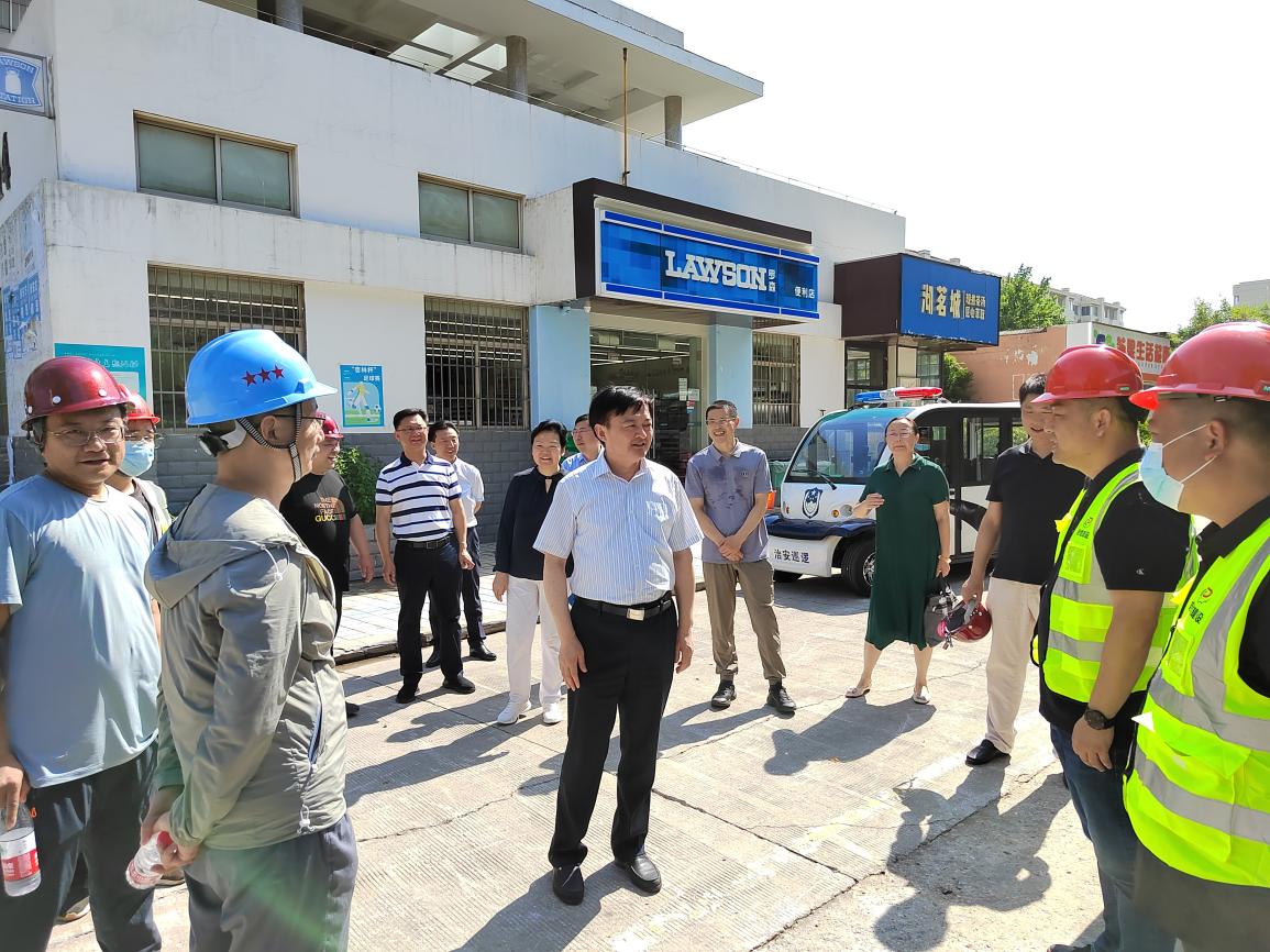 程纯一行先后走访了仙林校区东大门门岗、学生公寓和杏林路施工改造现场、青年教师公共租赁住房建设工地、西大门门禁建设现场等地,详细了解各项目工程进度、安全管理等情况,并向一线施工作业人员送上防暑降温用品。