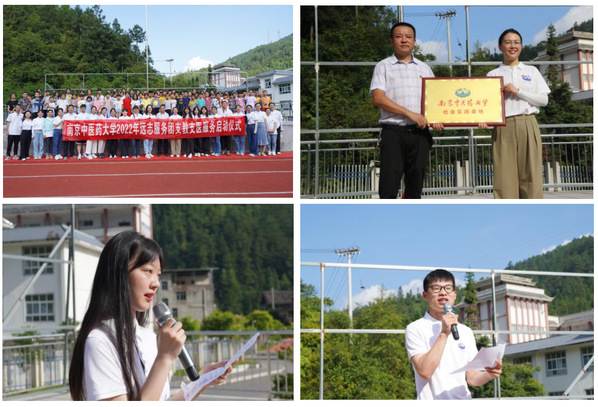 7月15日上午,2022年远志服务团贵州支教支医行启动仪式在榕江县栽麻镇中心校举行。栽麻镇中心校校长罗涛,我校团委副书记丁思喆共同为“南京中医药大学社会实践基地”揭幕,继续以山村学校为支撑,搭建好南中医与黔东南大地的桥梁。校学生会主席、卫生经济管理学院2019级公共事业管理专业叶晗,第一临床医学院2020级中医内科学硕士研究生孙鑫分别代表远志服务团、贯众硕博医疗服务团师生志愿者发言。
